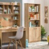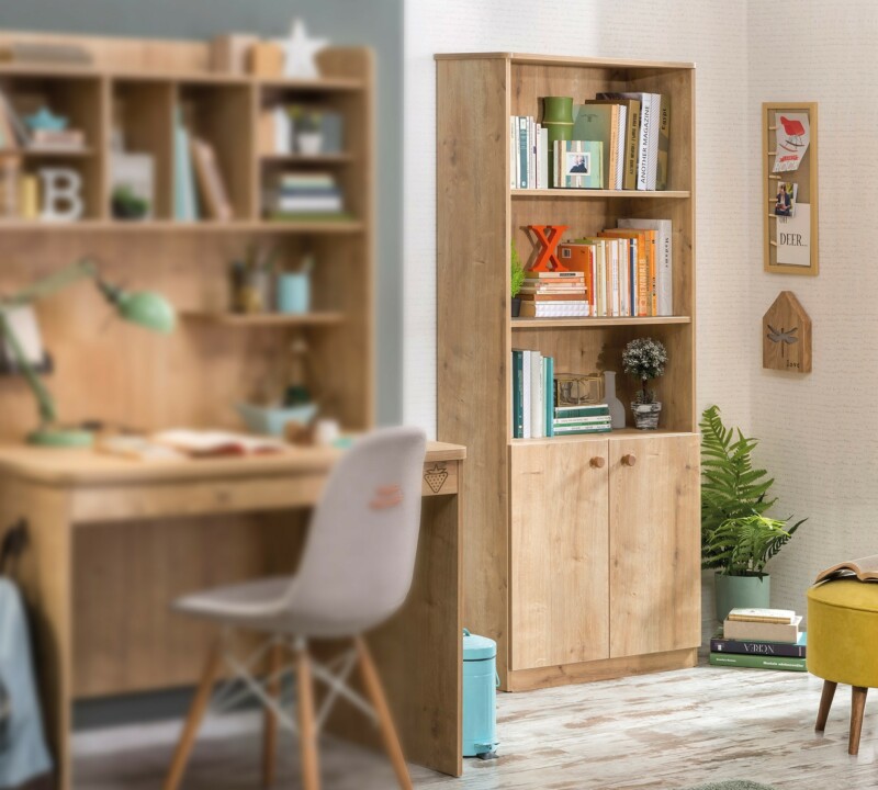 Das Mocha-Bücherregal bietet mit seinem großen Innenvolumen und zahlreichen Regalen eine funktionale Lösung für das Zimmer eines Teenagers und sorgt mit seinem zweitürigen Schrankteil für ein aufgeräumteres Erscheinungsbild.